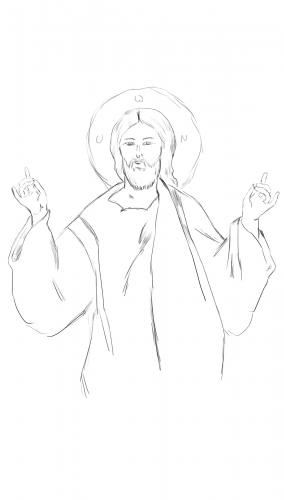 Reprezentat ca un bărbat tânăr, văzut frontal, cu părul ondulat şi barba scurtă tăiată rotund, Iisus este îmbrăcat în tunică lungă peste care este drapat chitonul. Binecuvântează cu ambele mâini. iar în jurul capului poartă nimbul cruciger.