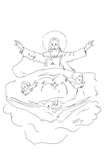 Dumnezeu Sabaot este reprezentat cu toate trăsăturile specifice iconografiei Tatălui (vezi canonul Dumnezeu- Tatăl), însă din punct de vedere al gesticii apare cu brațele ridicate deaspura capului într-un gest amplu de binecuvântare, privind asupra creației.