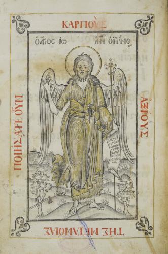 Titlu: Synopsis tēs nychtēmerou akolouthias;ilustrație;Ho Agios Iōan ho Pr<o>d<ro>mos;
